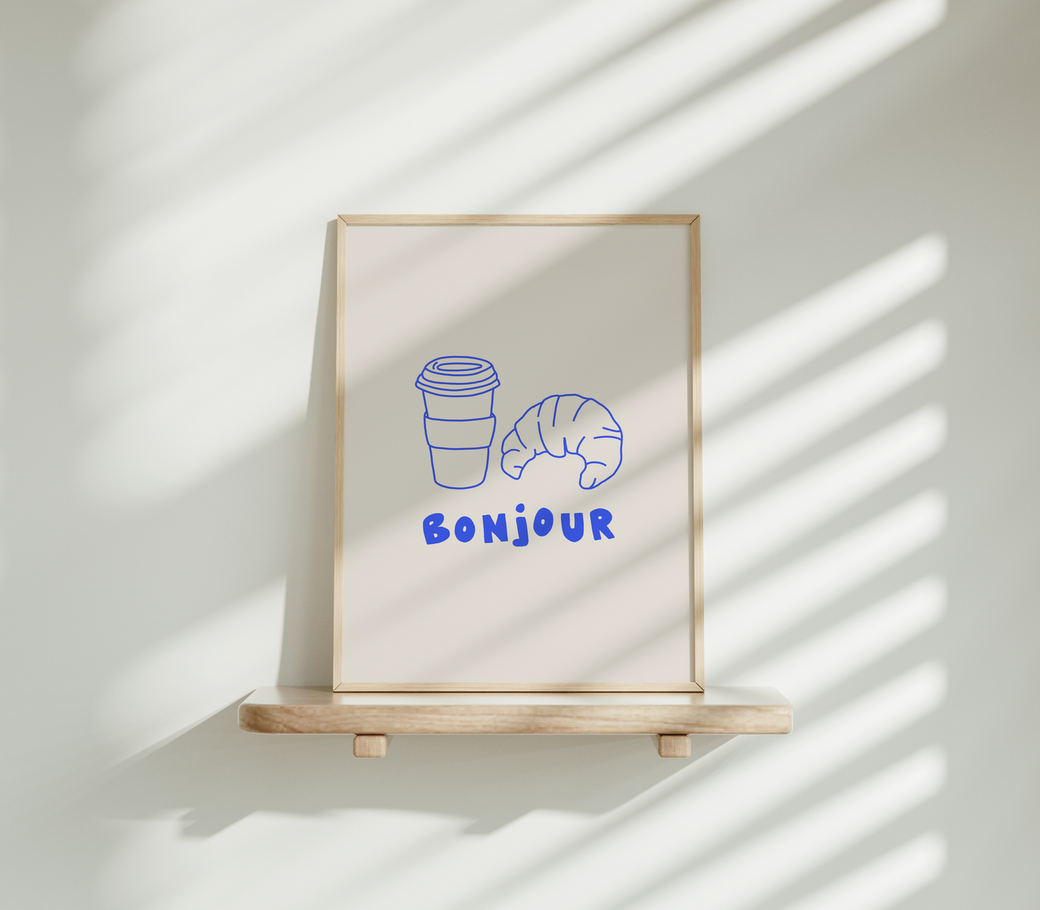 Modernes Poster, das mit einem liebevoll illustrierten Croissant und einer Tasse Kaffee sofort französisches Frühstücksgefühl aufkommen lässt. Der Schriftzug „Bonjour“ verleiht dem Motiv einen freundlichen, positiven Start-in-den-Tag-Vibe.