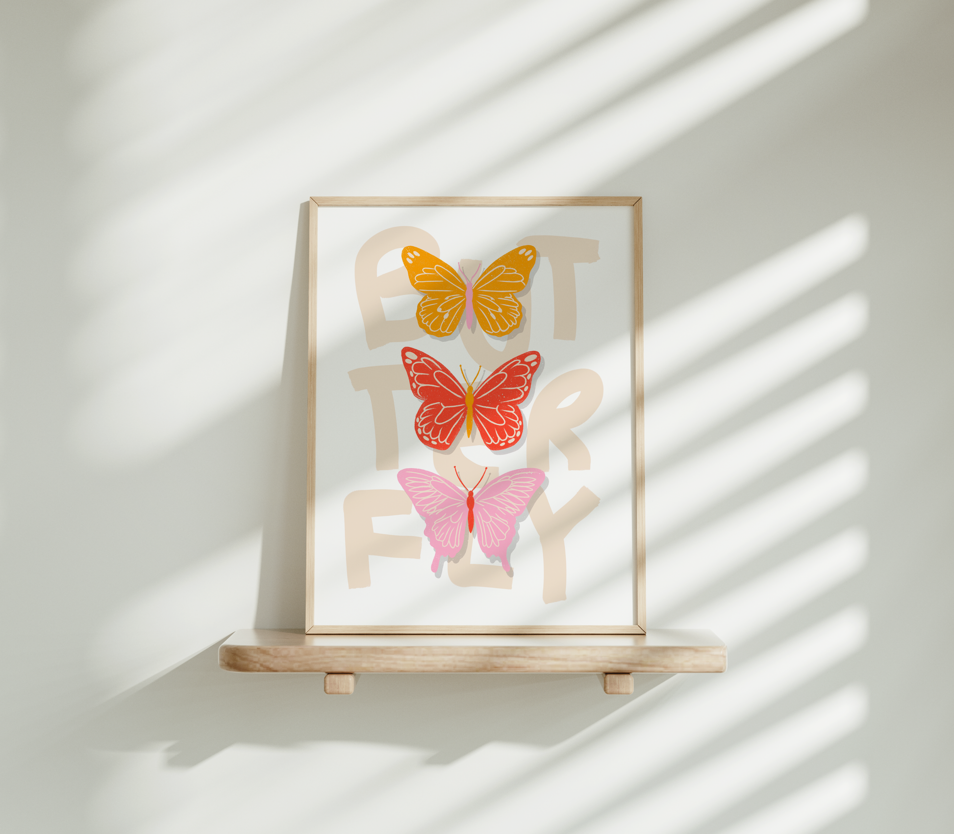 Bring a lively atmosphere to your space with this colorful yet minimalist poster featuring three different butterflies sitting on the word 'Butterfly'. The bright colors of the butterflies and the simple design of the word create a unique visual effect that stimulates the imagination and spreads joy. Perfect for any room that needs to be filled with lightness and beauty.