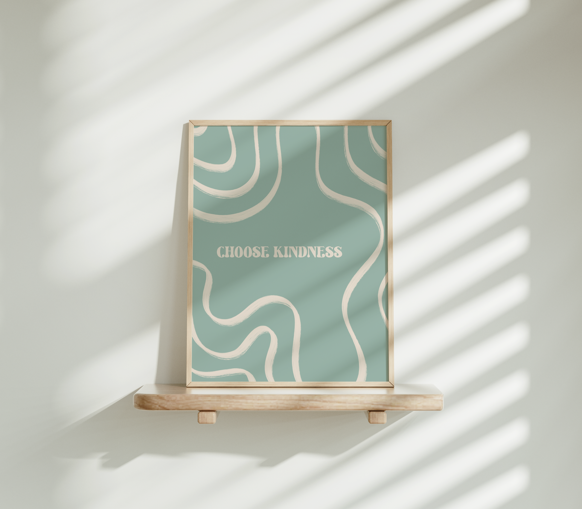 Bring a refreshing and positive atmosphere to your space with our minimalist mint green poster with the simple message 'Choose Kindness'. The delicate color and clear message remind you that kindness is always a good choice. Perfect for any room that you want to be characterized by harmony and compassion.
