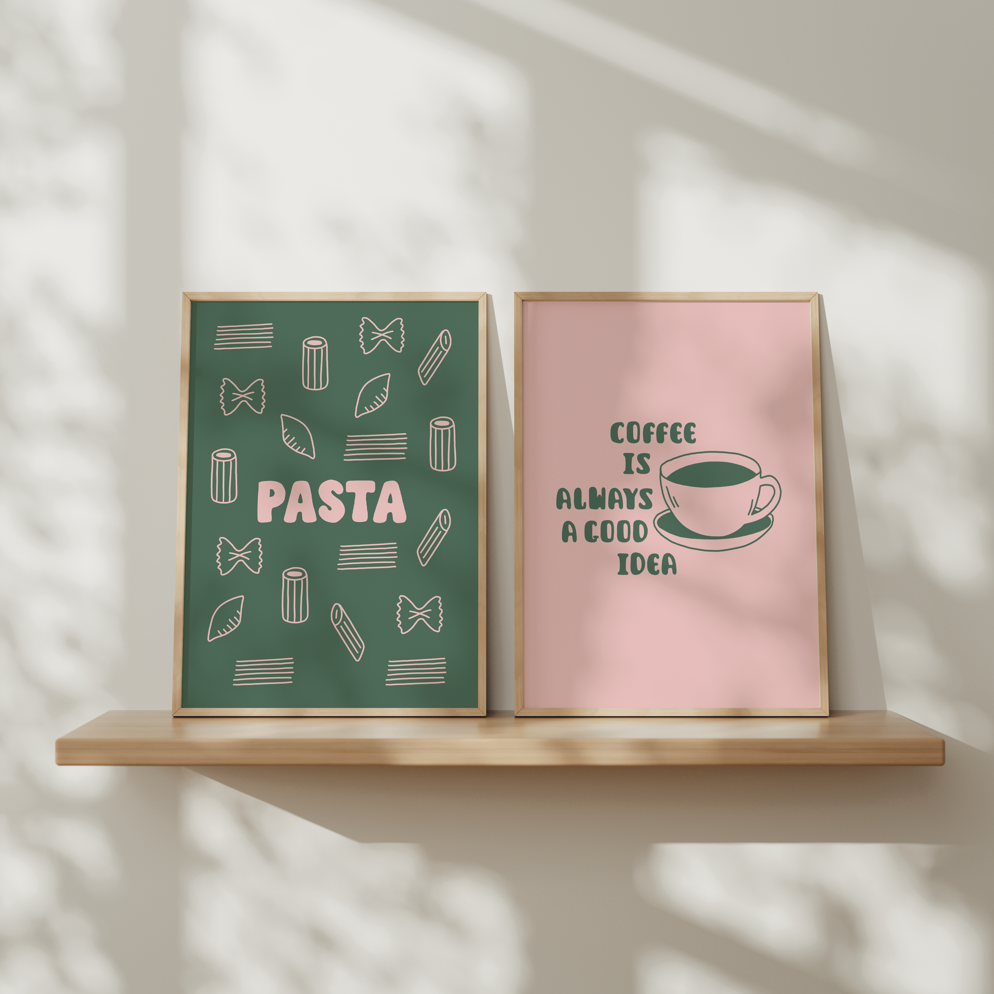 Dieses charmante 2er-Poster-Set in frischer Grün- und zarter Rosa-Farbpalette bringt liebevolle Food-Vibes in deine Küche. Diese Illustrationen vereinenGenuss und Gemütlichkeit auf moderne Art.