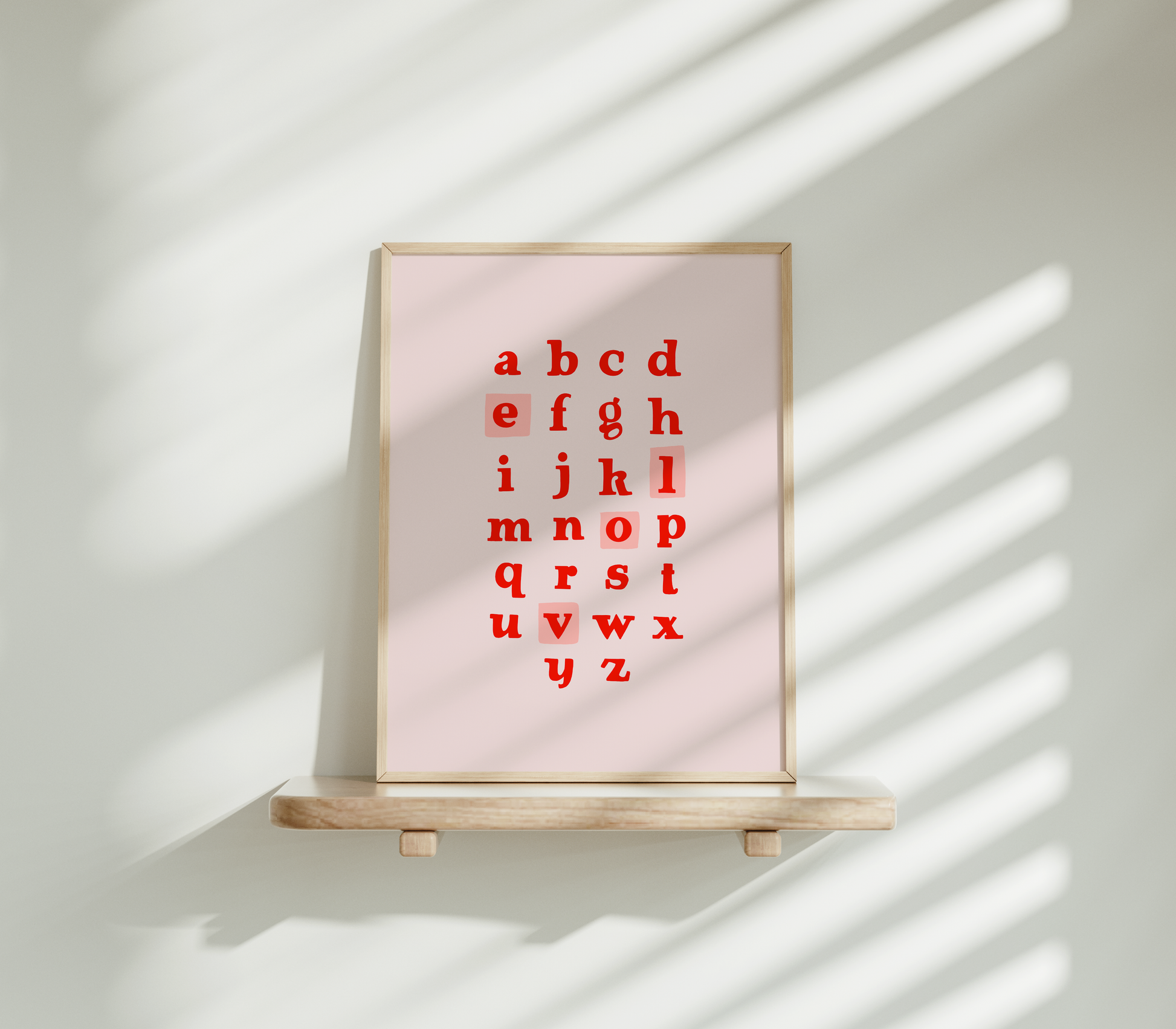 Awaken love with the alphabet poster, where the letters L, O, V and E are highlighted. A stylish design that subtly conveys the message of love and fills any room with positive energy. Perfect for romantics and anyone who wants to celebrate the power of love.