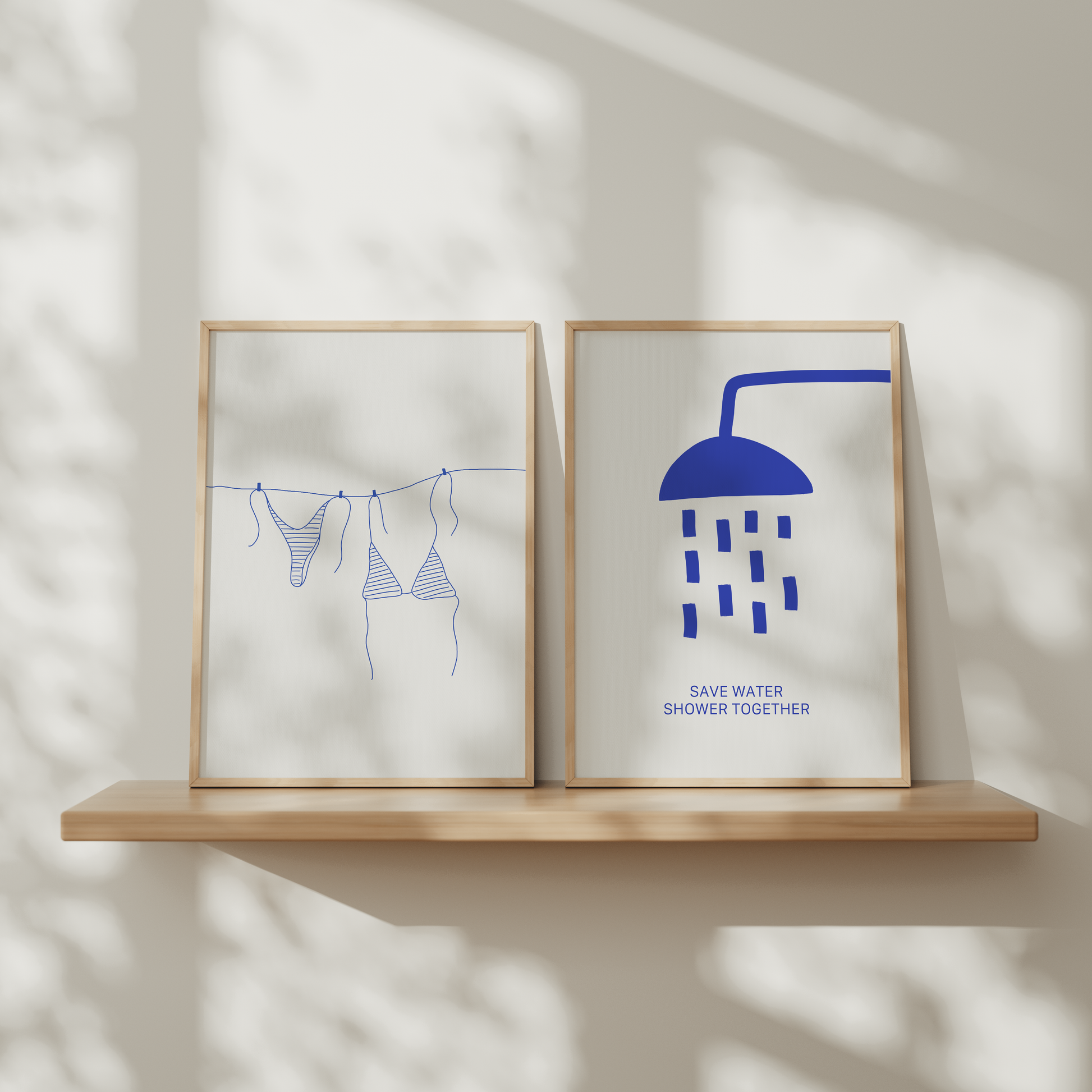 Dieses stylische 2er-Poster-Set bringt moderne Vibes ins Badezimmer. Ein minimalistischer blauer Bikini, der locker an einer Leine hängt, sorgt für sommerliche Leichtigkeit und feminine Eleganz. Dazu gesellt sich eine freche Illustration einer Dusche mit dem witzigen Spruch Save Water, Shower Together – modern, nachhaltig und mit einem Augenzwinkern.