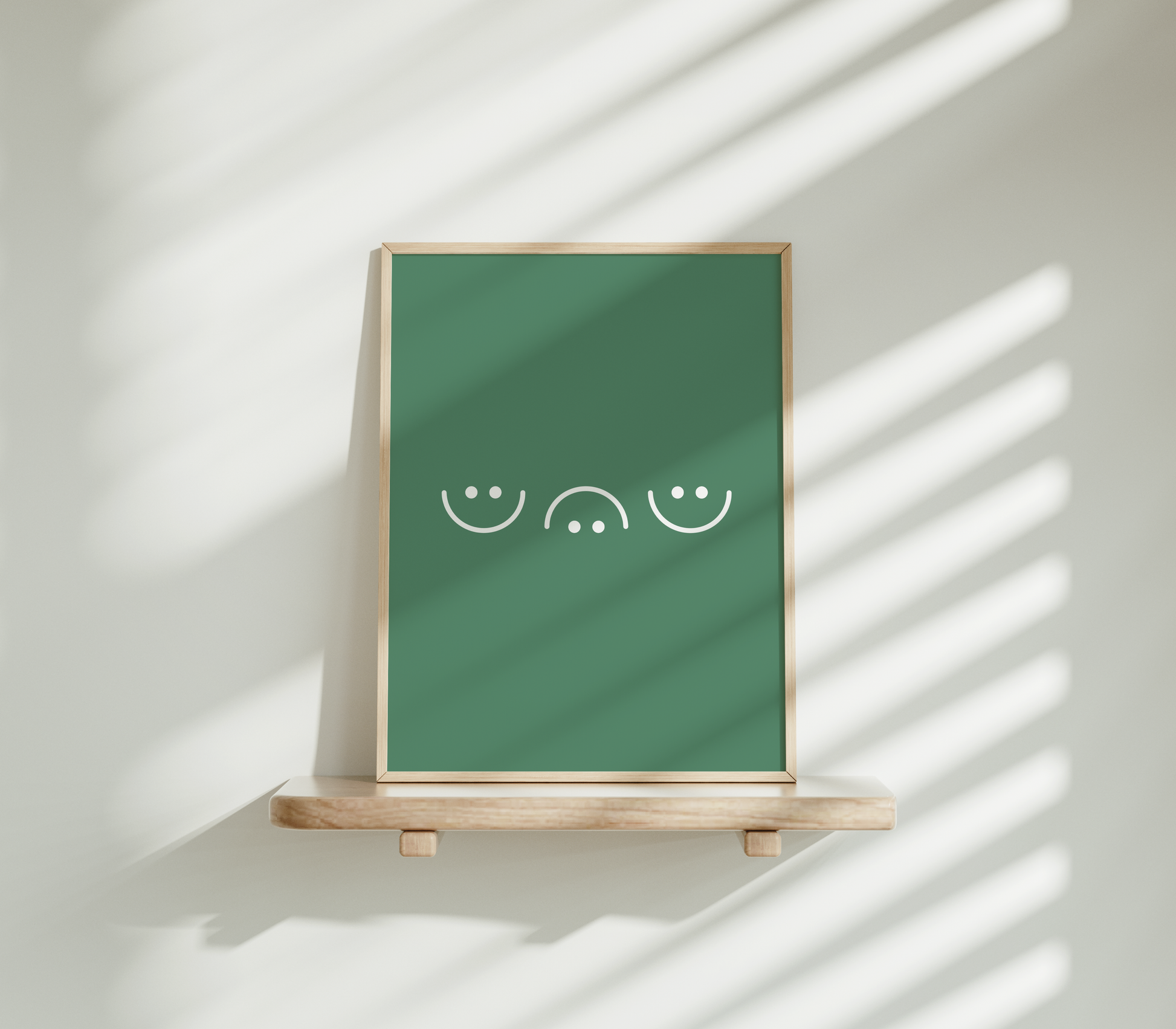 Our poster in bold green shows three happy smileys. This lively combination brings happiness and positive vibes to any room. Perfect for creating a cheerful and refreshing atmosphere.