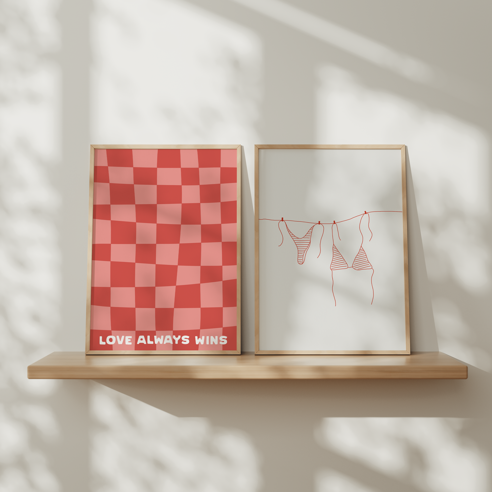Dieses 2er-Poster-Set vereint feminine Eleganz und kraftvolle Botschaften in einer harmonischen Farbwelt aus Rosa, Rot und Beige. Der kraftvolle Spruch Love Always Wins ist in liebevoll gestalteten Kästchen arrangiert und strahlt positive Energie aus. Ergänzt wird das Set durch einen minimalistischen Bikini, der locker an einer Leine hängt.