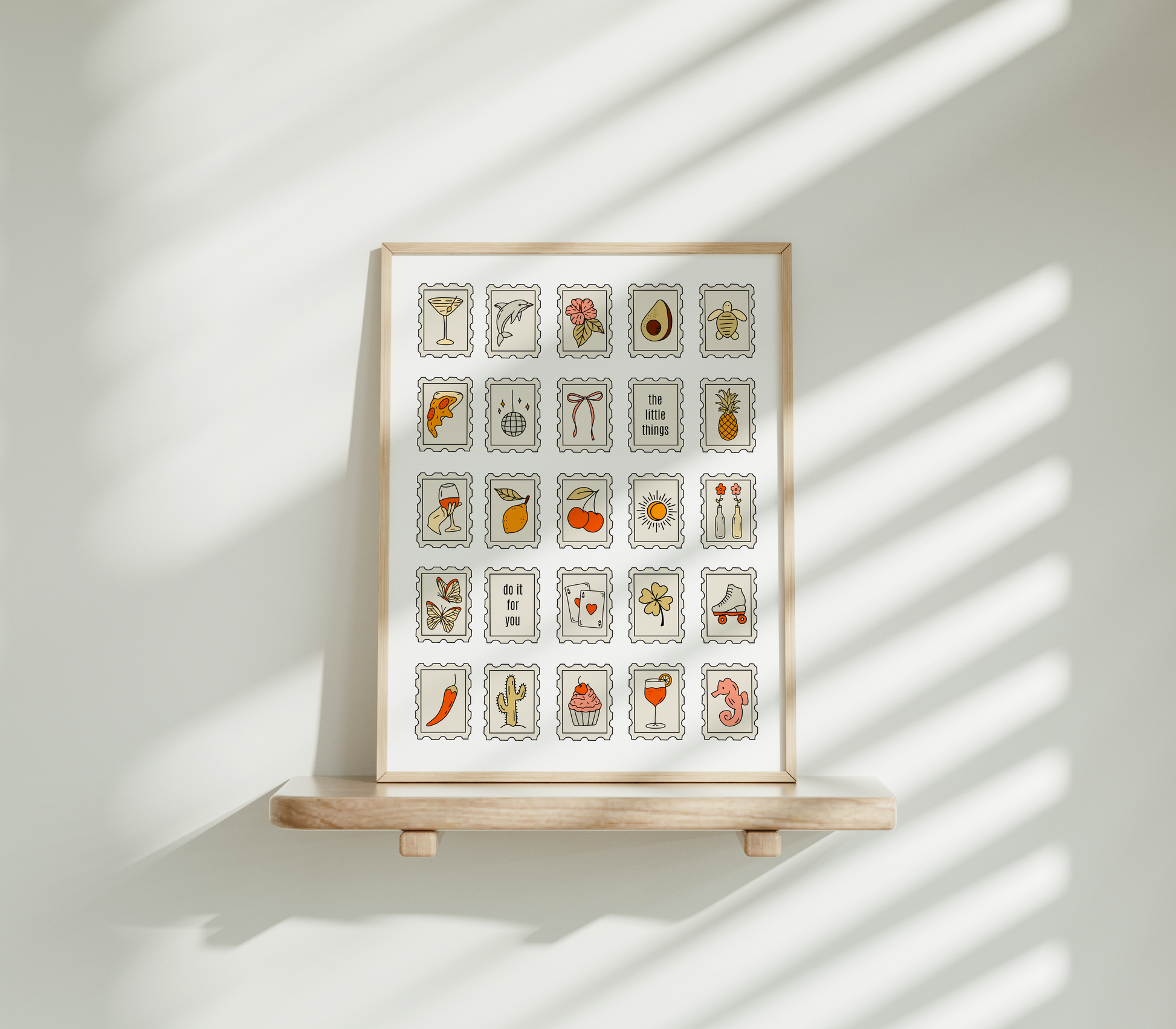 Dieses Poster in warmen Retro-Farben ist eine nostalgische Liebeserklärung an die kleinen, kostbaren Augenblicke des Alltags. Zahlreiche liebevoll gestaltete Briefmarken zeigen charmante Icons.
