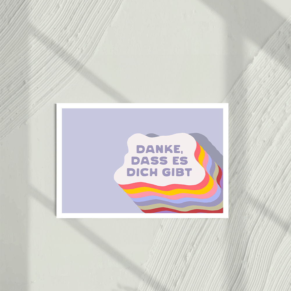 Bringe mit unserer farbenfrohen Grußkarte, die die Worte 'Danke, dass es dich gibt' trägt, eine lebendige und herzliche Atmosphäre in deine Feierlichkeiten. Die lebhaften Farben und die liebevollen Worte erinnern daran, wie wertvoll und einzigartig die Person ist, der du dankst.