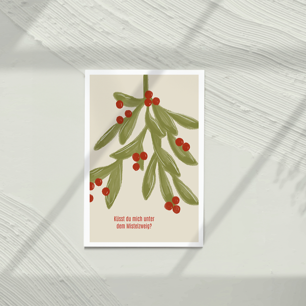 Eine charmante, leicht verspielte Weihnachtskarte mit einem zart illustrierten Mistelzweig auf hellem Hintergrund. Darunter steht in einer liebevoll geschwungenen Schrift der Satz „Küsst du mich unter dem Mistelzweig?“. Diese Karte bringt auf romantische und humorvolle Weise Weihnachtsflair und ein kleines Augenzwinkern in jede Grußbotschaft.