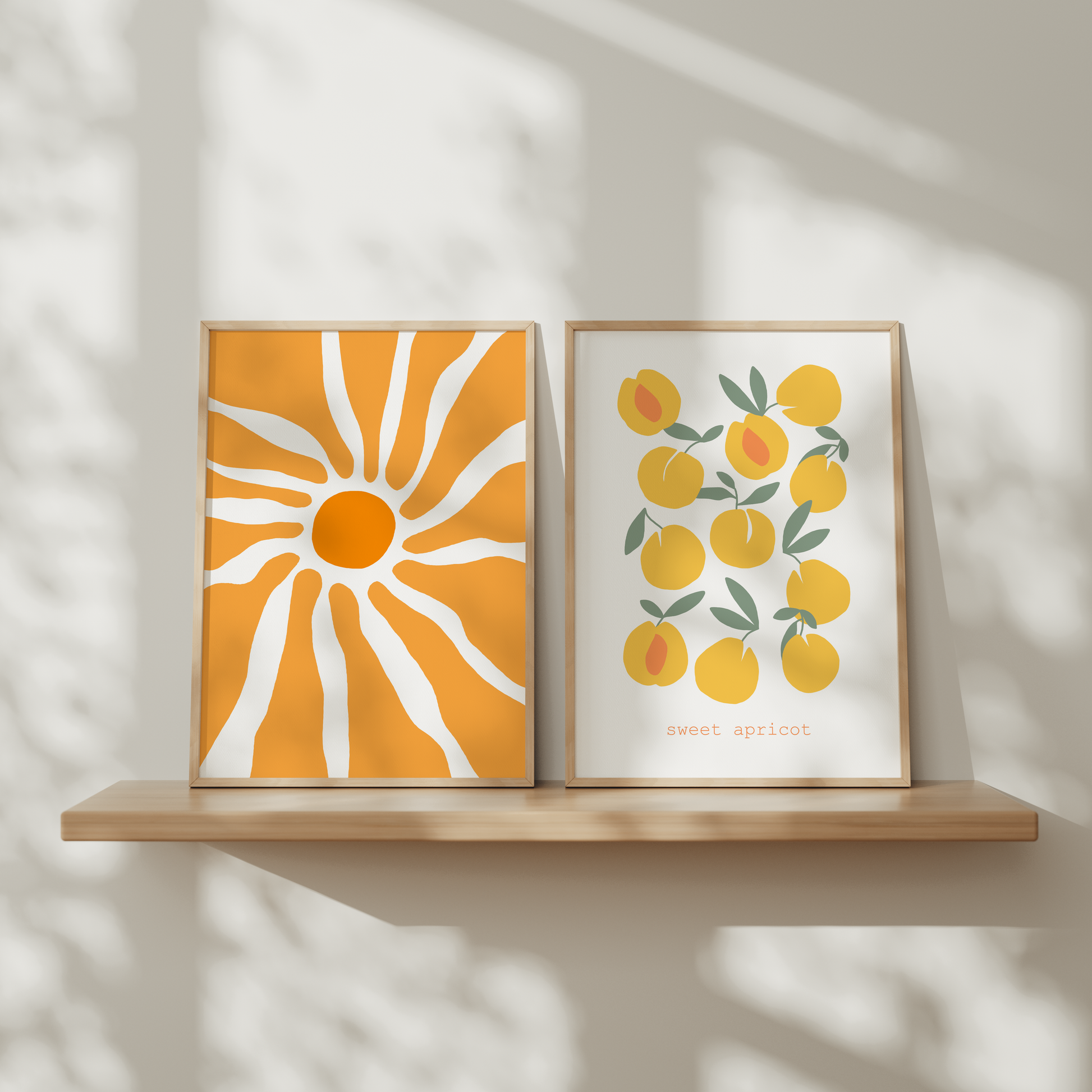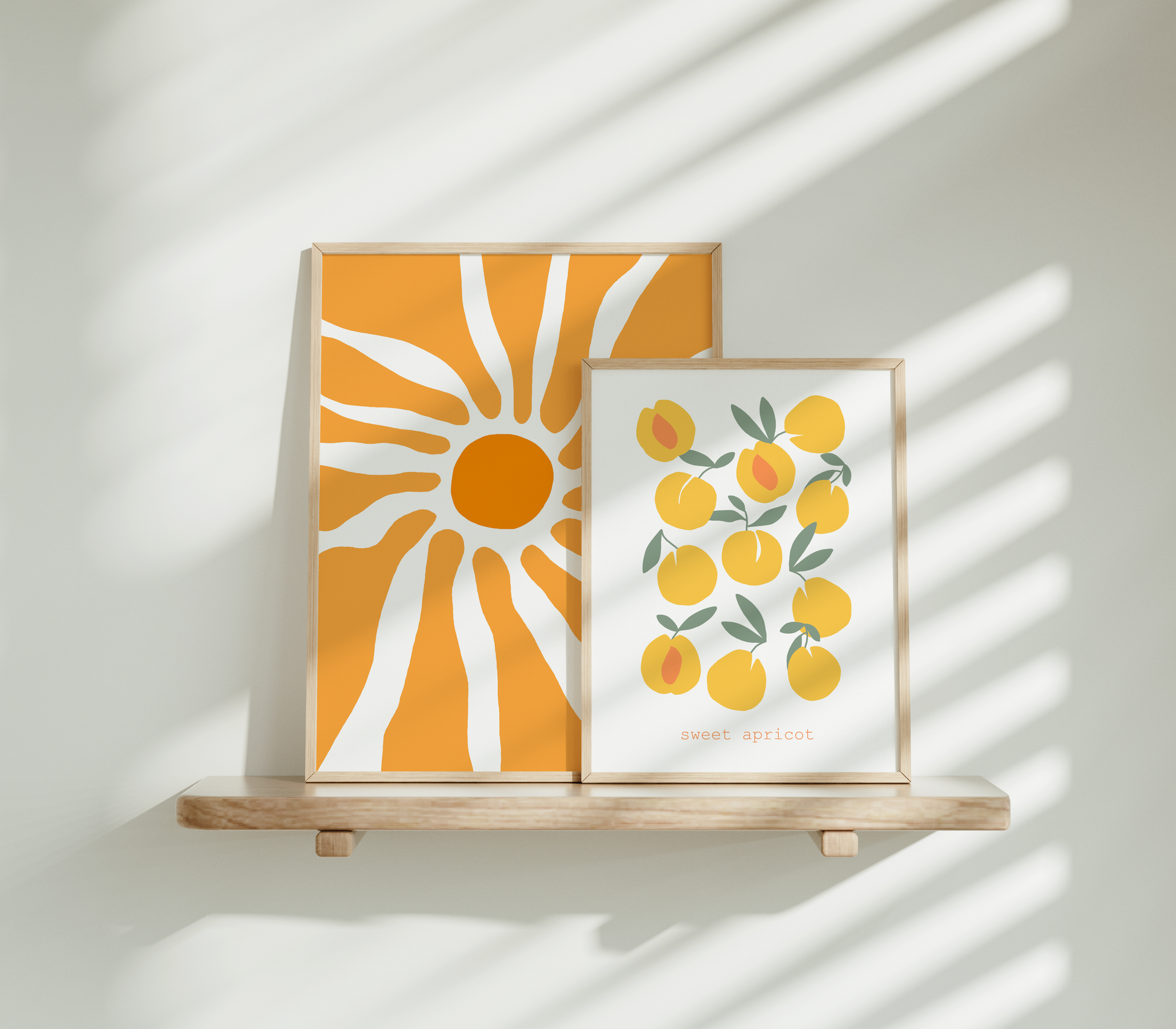 Das Sonnen-Poster strahlt mit warmen Gelb- und Orangetönen pure Energie und gute Laune aus. Das Apricot-Poster ergänzt das Set mit seinem sanften, fruchtigen Farbton und versprüht eine frische, leichte Sommer-Atmosphäre. Gemeinsam bringen sie ein warmes, positives Feeling in jeden Raum.