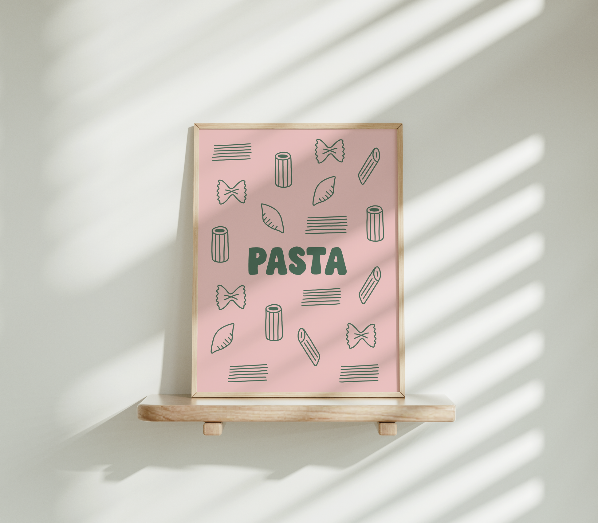 Knallige Farben, verspielte Formen – dieses Poster bringt Penne, Fusilli & Co. direkt in deine Küche. Ein Augenschmaus für alle, die gutes Essen und gutes Design liebe.