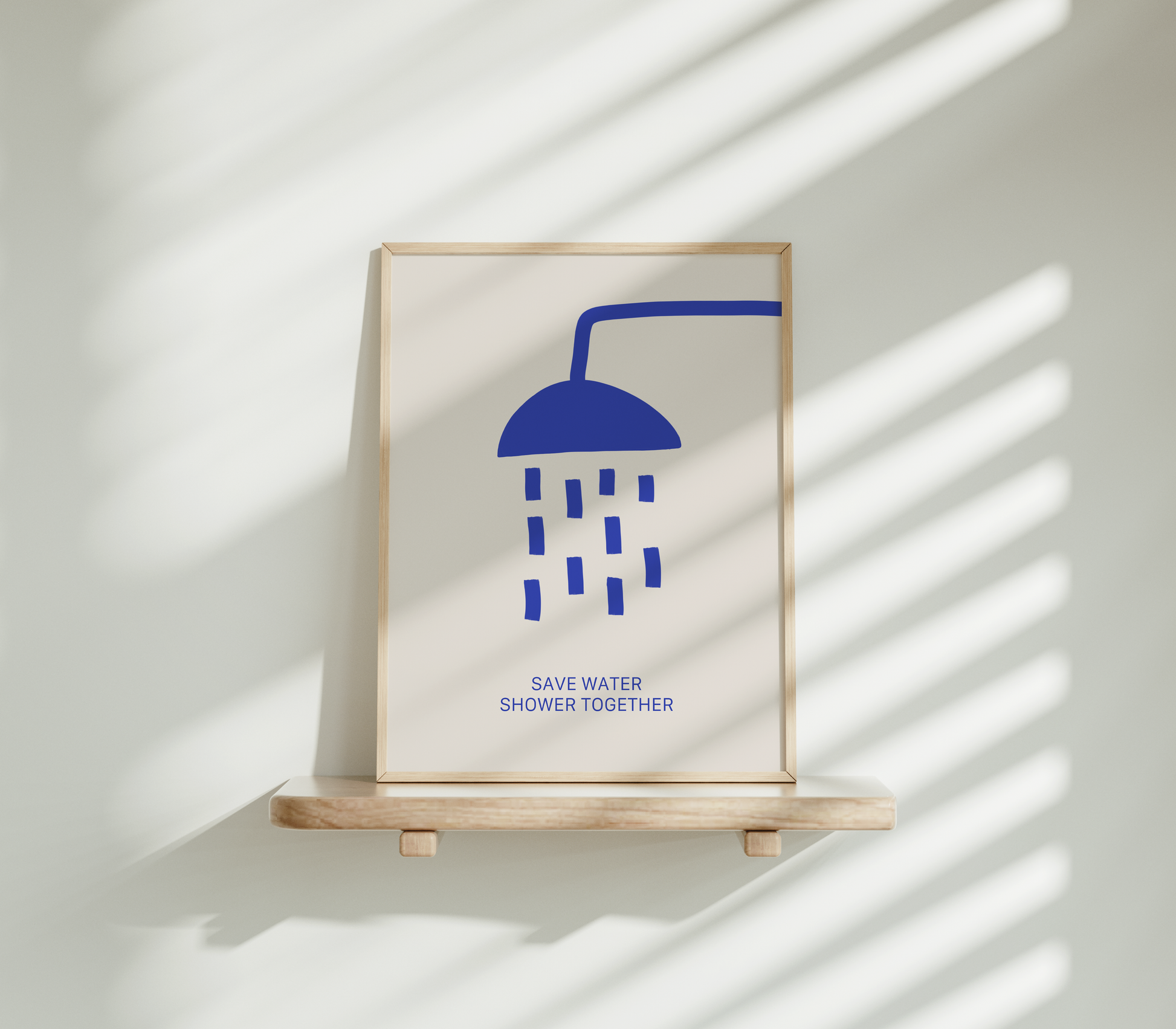 Dieses humorvolle Poster zeigt eine stilisierte, blaue Dusche auf einem beigen Hintergrund, begleitet vom augenzwinkernden Spruch 'Save Water, Shower Together'. Mit seiner charmanten Botschaft und dem minimalistischen Design bringt es Leichtigkeit und Witz in dein Badezimmer – ein echter Hingucker mit einer nachhaltigen Note.
