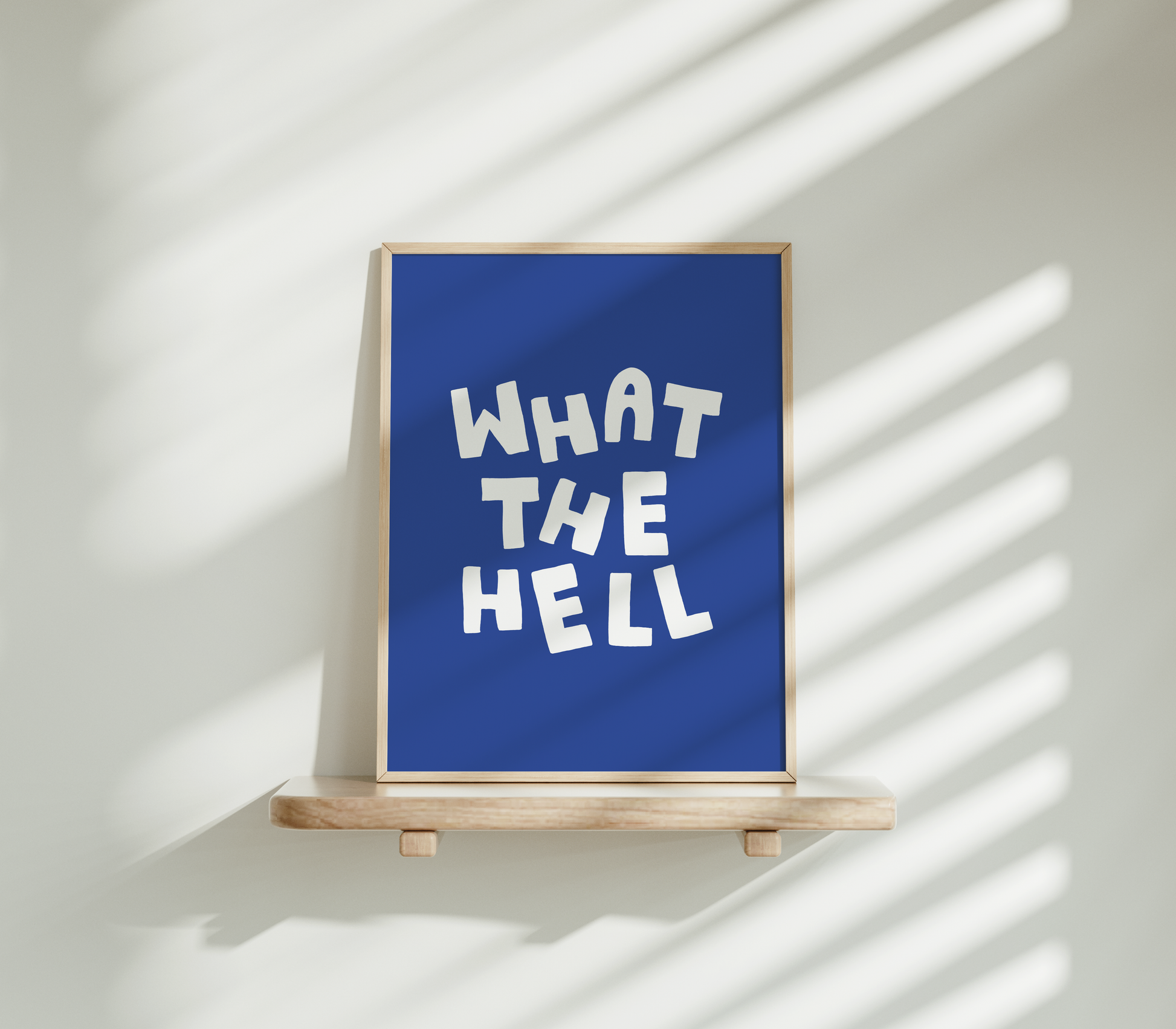 Der knallig blaue Hintergrund strahlt Intensität und Persönlichkeit aus, während der Schriftzug „what the hell“ in klarem Weiß darüber steht – modern, frech und absolut plakativ.