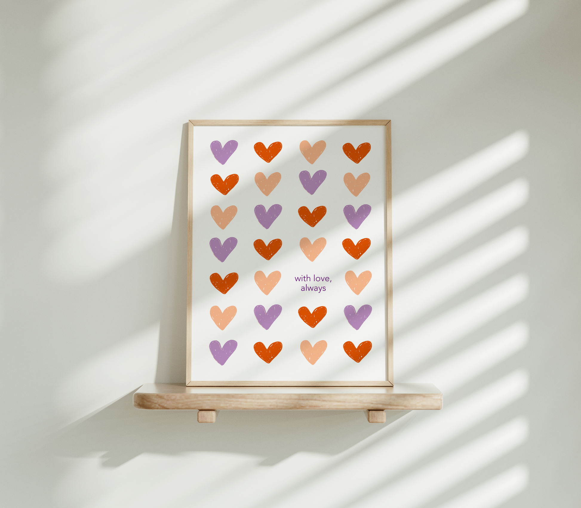 Ein liebevolles Poster voller Herzen und der berührenden Botschaft "With love, always". Das Design versprüht Wärme und Geborgenheit – perfekt, um jedem Raum eine Extraportion Liebe zu verleihen.